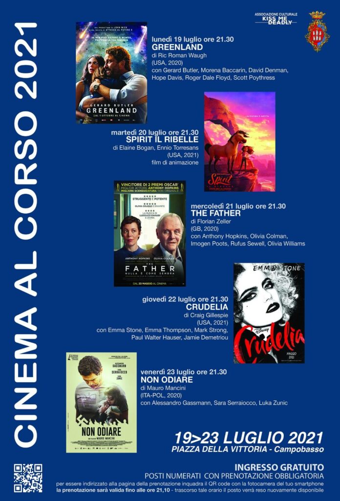 L’ingresso a questo come al resto degli spettacoli di “Cinema al Corso” che si terranno dal 19 al 23 luglio in Piazza della Vittoria a Campobasso, sarà gratuito, con però posti numerati e prenotazione obbligatoria tramite apposita pagina alla quale si viene indirizzati inquadrando il codice QR presente sulle locandine dell’evento.