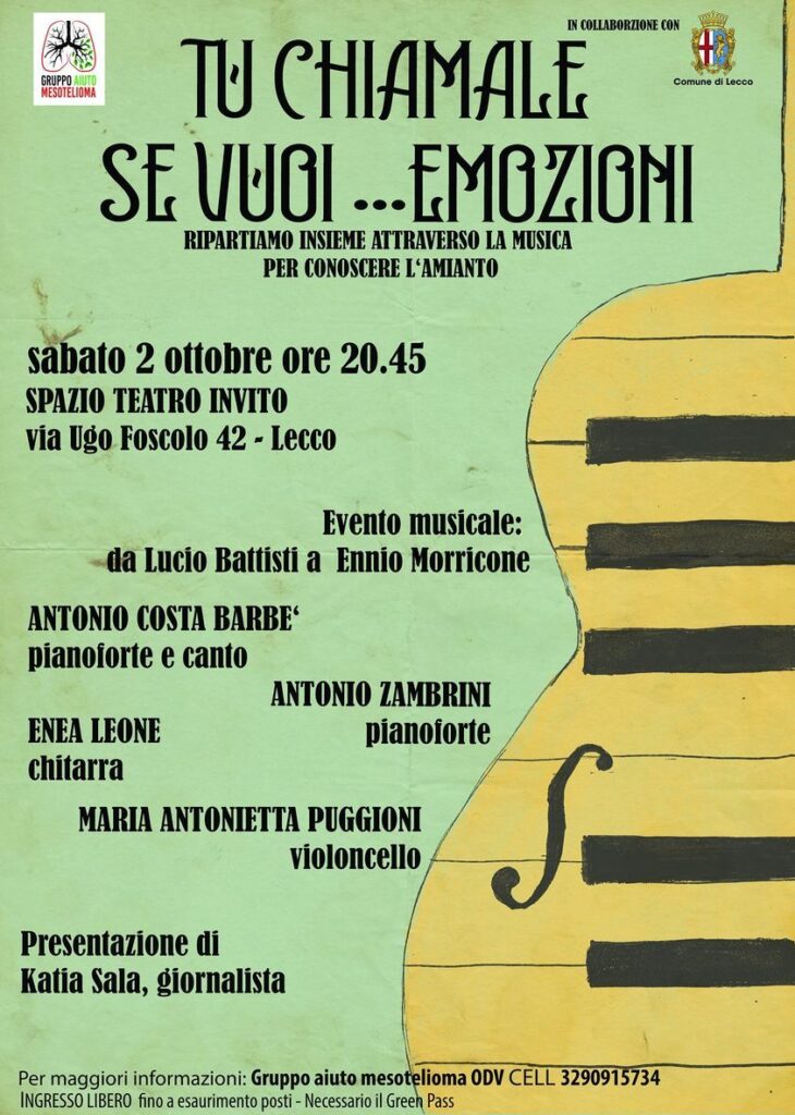 Lecco, una serata organizzata dal Gruppo Aiuto Mesotelioma (GAM) in collaborazione con il Comune di Lecco per sensibilizzare i cittadini sui rischi derivanti dell’esposizione all’amianto: sabato 2 ottobre alle 20.45 presso l’auditorium Sorelle Villa – Spazio Teatro Invito andrà in scena lo spettacolo “Tu chiamale se vuoi… emozioni. Ripartiamo insieme attraverso la musica per conoscere l’amianto”. Un momento di sensibilizzazione che nasce nel solco delle attività di informazione che il gruppo promuove durante tutto il corso dell’anno e che passano anche attraverso lo sportello informativo amianto, riallestito in municipio da settembre, dopo un anno mezzo di attività svolta a distanza. Le consulenze offerte dagli esperti sull’amianto, sulle malattie correlate e sul sostegno alle persone malate, sui loro diritti, sugli adempimenti di legge in materia e sui bandi per la rimozione, affiancano la costante attività di sensibilizzazione attiva sul territorio.