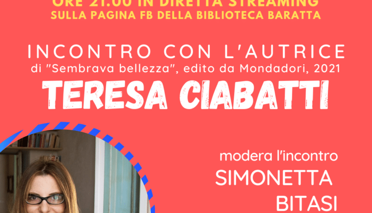 Venerdì 23 aprile alle 21 in diretta sulla pagina Facebook della Biblioteca Baratta è in programma l’incontro con la scrittrice Teresa Ciabatti, autrice di “Sembrava Bellezza” (edito da Mondadori, 2021), in un appuntamento condotto da Simonetta Bitasi. L’evento potrà essere seguito in streaming partendo dalla sezione “Video in diretta in programma” pochi minuti prima dell’evento. Se non volete perdervi l’incontro, ricordatevi di cliccare su “Ricevi il promemoria”.