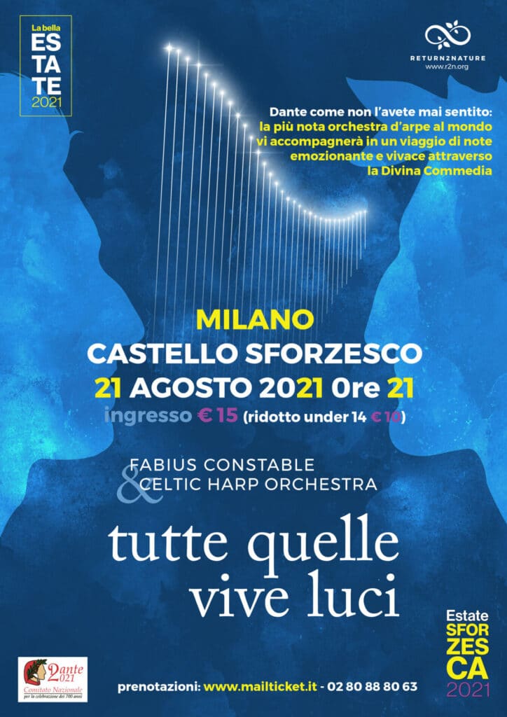 Sotto l’alto Patrocinio del Comitato Nazionale per le celebrazioni dei 700 anni dalla morte di Dante Alighieri e nel contesto della prestigiosa Estate Sforzesca – La Bella Estate 2021 la rassegna di spettacoli dal vivo più lunga d’Italia promossa e coordinata dal Comune di Milano – Assessorato alla Cultura e Area Spettacolo, protagonista proprio lui, il Vate, la sua opera Summa come neanche lui avrebbe potuto immaginare si potesse portare al volgo e una formazione orchestrale d’eccezione che non ha tardato a farsi notare sul panorama internazionale e a guadagnarsi l’appellativo di dispensatori seriali di bellezza : la Celtic Harp Orchestra diretta e fondata Fabius Constable nome d’arte del Cav. Fabio Conistabile.