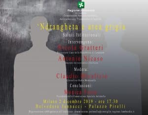 Il 2 dicembre 2019 alle ore 17.30 presso il Belvedere Jannacci di Palazzo Pirelli la Commissione Antimafia, Anticorruzione Trasparenza e Legalità di Regione Lombardia organizza un incontro con il Procuratore capo di Catanzaro Nicola Gratteri e con il professore Antonio Nicaso per approfondire il concetto di area grigia e il suo ruolo in relazione al fenomeno mafioso ed in particolare alla ‘ndrangheta, con la moderazione di Claudio Micalizio giornalista di Radio Monte Carlo.