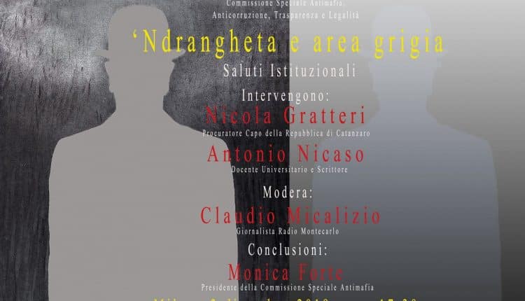 Il 2 dicembre 2019 alle ore 17.30 presso il Belvedere Jannacci di Palazzo Pirelli la Commissione Antimafia, Anticorruzione Trasparenza e Legalità di Regione Lombardia organizza un incontro con il Procuratore capo di Catanzaro Nicola Gratteri e con il professore Antonio Nicaso per approfondire il concetto di area grigia e il suo ruolo in relazione al fenomeno mafioso ed in particolare alla ‘ndrangheta, con la moderazione di Claudio Micalizio giornalista di Radio Monte Carlo.