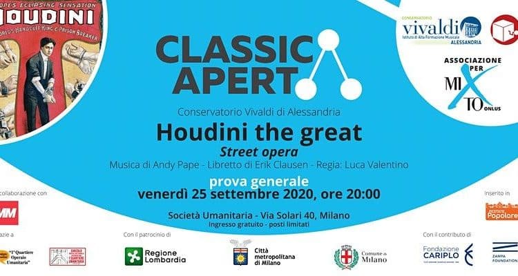 Si tratta della prima opera del compositore statunitense Andy Pape, su libretto di Erik Clausen e per la regia di Luca Valentino. ‘Houdini The Great’ parla di migrazione e di libertà, immaginando il mago appena arrivato a New York e raccontandone le vicende e i legami affettivi, in un allestimento da street opera essenziale e ispirato alla Commedia dell’Arte, con pochi interpreti e pochi strumenti, 4 cantanti e 6 musicisti, ricco di trucchi e di emozione.