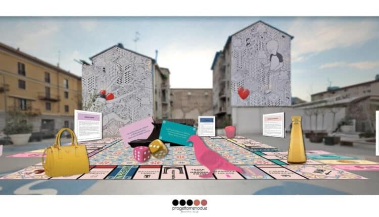 L’installazione vuole celebrare la città di Milano e le tante donne, milanesi di nascita o adozione, che la rendono speciale e unica al giorno d’oggi. Progettomenodue, lo studio di decorative design tutto al femminile fondato Sara Delfanti e Emanuela Tarlocco specializzato in allestimenti dal forte impatto visivo, ha creato una scenografia ispirata ad un classico gioco da tavolo, rivisitato per l’occasione in formato gigante, con le pedine in stampa 3D che richiamano oggetti della “milanesità”: la borsa (la moda), il piccione (le piazze e gli spazi collettivi), il panettone (la cultura gastronomica).