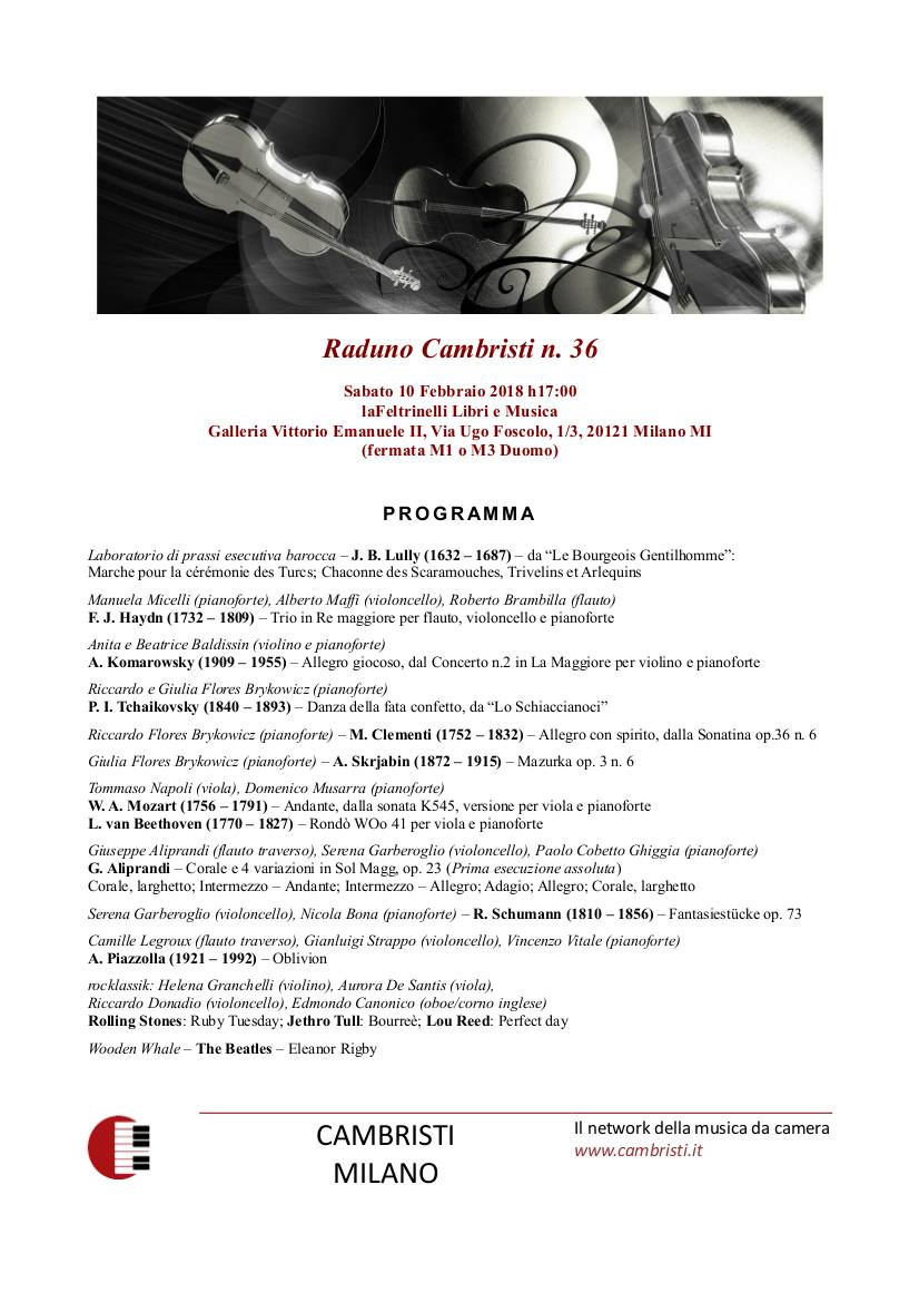 I Cambristi Milano sono un gruppo di circa 190 musicisti amatori che condividono la passione per la musica da camera. Una volta al mese i Cambristi si esibiscono in un raduno musicale aperto al pubblico in luoghi inconsueti e sempre diversi della città. Non solo un concerto, ma anche un’occasione allegra e informale per conoscere nuovi amici che condividono la passione per la musica classica.