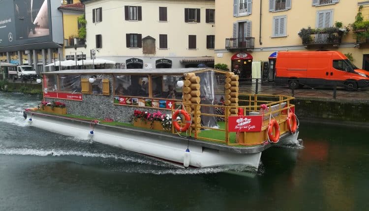 Milano 22 maggio. La fedele riproduzione di uno chalet di montagna galleggiante da qualche giorno naviga su e giù nel Naviglio Grande, costellato di bandiere della Svizzera, da musica e dall’inebriante aroma di formaggi come l’Emmentaler, Le Gruyère e lo Sbrinz.