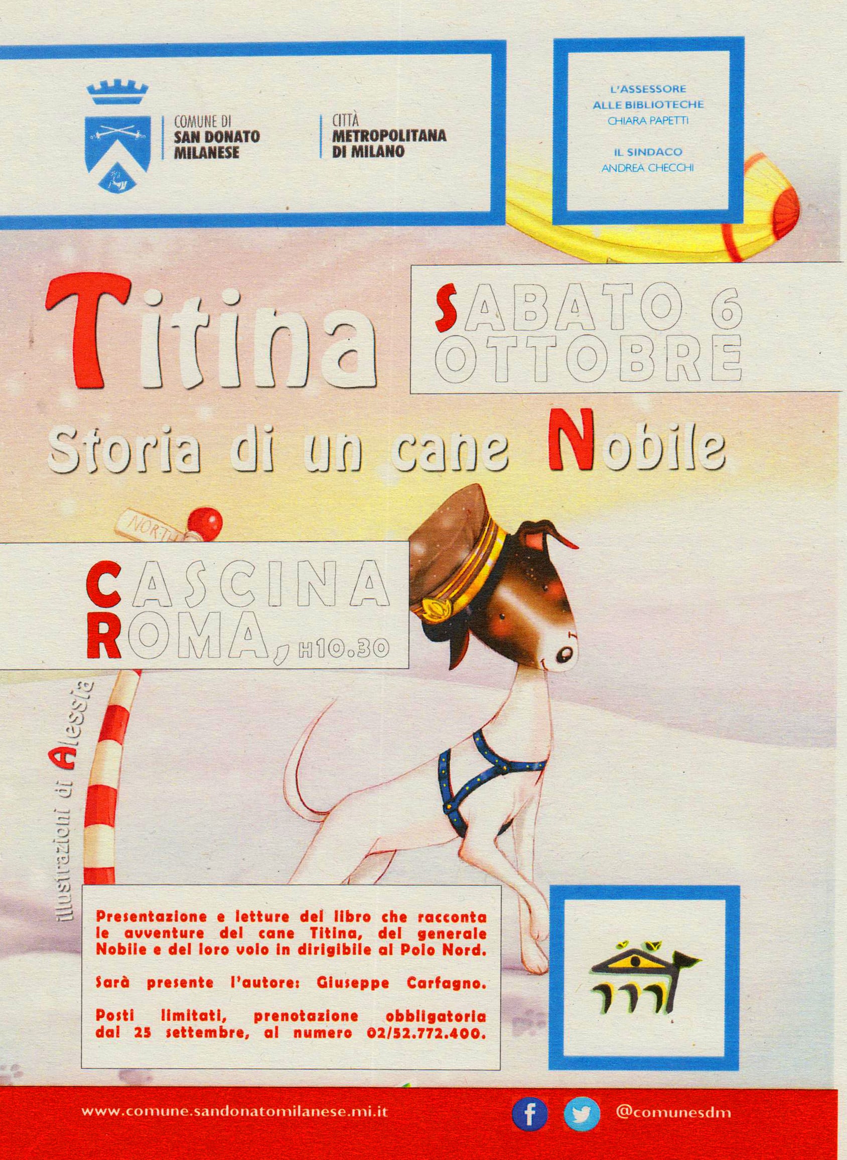 Da non perdere la presentazione del libro “Titina. Storia di un cane Nobile” presso lo Spazio Cultura di Cascina Roma a San Donato Milanese il prossimo 6 ottobre ore 10.30. L’Autore Giuseppe Carfagno, lucano ma da decenni trapiantato a Milano, classe 1950, oggi pensionato ex professore di lettere al Istituto Italo Calvino e attualmente autore di numerose pubblicazioni per ragazzi. Tiene inoltre corsi di scrittura creativa presso biblioteche e l’Università Humaniter. Racconti esilaranti di Titina, uno dei cani più famosi della storia, le sue avventure e quelle del suo amico, il generale Umberto Nobile, uno dei pionieri e delle personalità più elevate della storia dell’aeronautica italiana, famoso per le due trasvolate in dirigibile del Polo Nord (1926 e 1928).