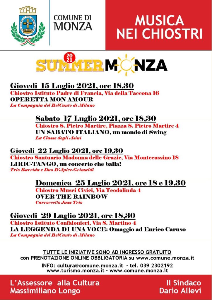 Tutti i concerti sono gratuiti, ma la prenotazione è obbligatoria. Le info sul sito del Comune di Monza. In caso di maltempo i concerti si terranno nelle strutture coperte annesse ai Chiostri.