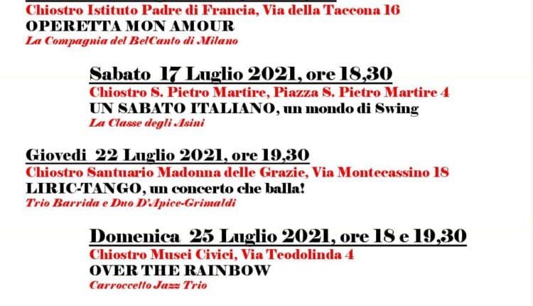 Il secondo appuntamento è sabato 17 luglio, sempre alle ore 18.30, nel Chiostro di San Pietro Martire (piazza San Pietro Martire 4). Il protagonista di «Un sabato italiano, un mondo di swing» sarà lo swing con i brani più famosi di Alberto Rabagliati, Fred Buscaglione, Natalino Otto, Franck Sinatra e l’Orchestra Kramer. Sul palco il gruppo “La Classe degli Asini”: Roberto Antona (chitarra manouche), Stefano Torre (voce), Ivano Belloni (clarinetto e sax) e Marco Doldi (contrabbasso).