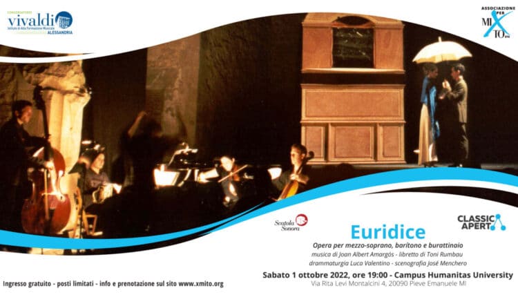 Sabato 1 ottobre 2022 alle ore 19:00 va in scena Euridice o I burattini di Caronte, opera per mezzo-soprano, baritono e burattinaio presso il Campus Humanitas University, per la regia di Luca Valentino, in collaborazione con il Conservatorio Vivaldi di Alessandria, l’ospitalità del Campus Humanitas University, il sostegno della Fondazione di Comunità Milano, la disponibilità del Gruppo Humanitas con i suoi volontari, delle associazioni e dei Comuni di Pieve Emanuele e Rozzano.