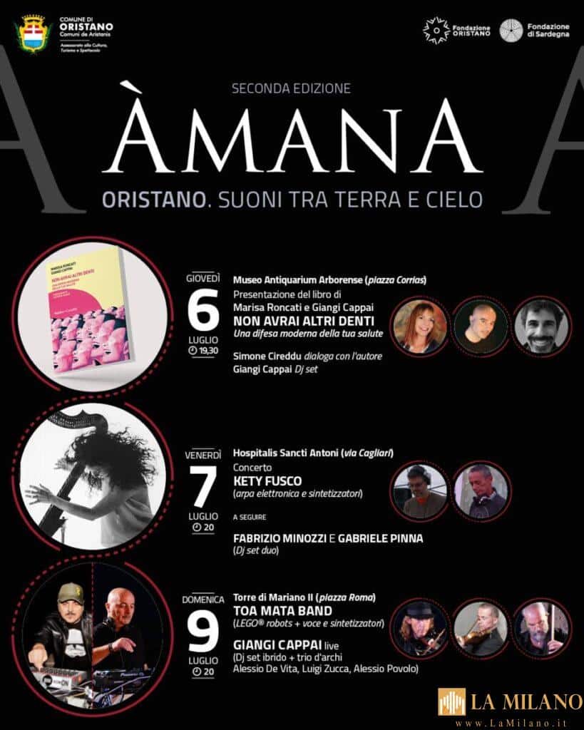 “La rassegna offre tre serate di grande interesse per il pubblico – commenta l’Assessore alla Cultura Luca Faedda -. I due concerti del 9 luglio, ai piedi della torre, saranno accompagnati dalle immagini trasmesse su due schermi di tutto lo spettacolo, ripetendo la formula di successo della prima edizione della manifestazione Àmana si conferma una produzione originale, ricca di suggestioni, che punta alla valorizzazione della Torre di San Cristoforo attraverso immagini e musica”.