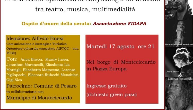 Una serata corale con numerosi artisti, lo storytelling si avvale di testi originali e si sviluppa con le musiche eseguite dalla violinista Elisabetta Matecena e il cantante Jonathan Maroncelli, le letture di Elisabetta Liz Marsigli, Gigi Sica, Maury Incen, Anya Bracci e la recitazione di Eleonora Rubechi Mensitieri. Particolare attenzione è stata data alla multimedialità per un racconto anche visivo. La collaborazione ai testi è di Lorenza Pigliapochi.