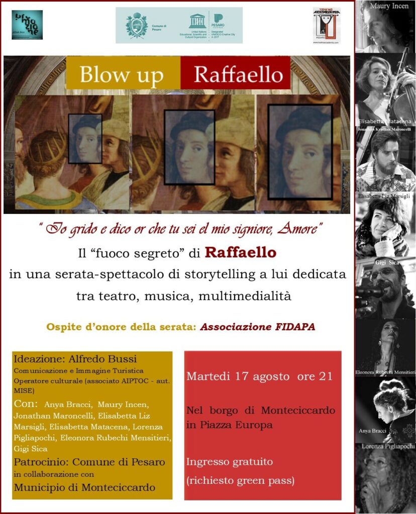 Pesaro, nel borgo di Monteciccardo, un evento dedicato a Raffaello tra teatro, musica e multimedialità per scoprire quello che lui definiva il suo “fuoco segreto”. 5 “blow up” scenici che esaltano aspetti della sua arte e della sua personalità per restituirci un Raffaello vivo e reale e allo stesso tempo ancor più ideale.