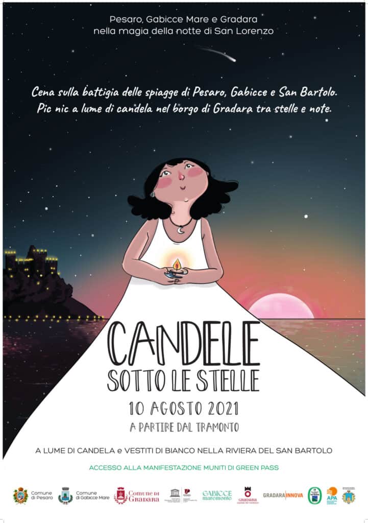 Rafforzata, inoltre, la sinergia con Gabicce Mare, come ha ricordato il primo cittadino Domenico Pascuzzi, «Candele sotto le stelle, segnerà una data storica per il territorio, perché si svolgerà il primo grande evento della neonata Riviera del San Bartolo, un progetto frutto di un lavoro di squadra importante. Durante la serata le 15 concessioni balneari di Gabicce si accenderanno della luce delle candele nell’intero chilometro di costa, a cui si accederà con il green pass. I prenotati potranno gustare le prelibatezze tipiche e tutta la bellezza del nostro mare». Prevista l’esibizione dei Musaico, il gruppo di Marco Petrucci e Francesco Ferrandi, storici autori dei Nomadi.