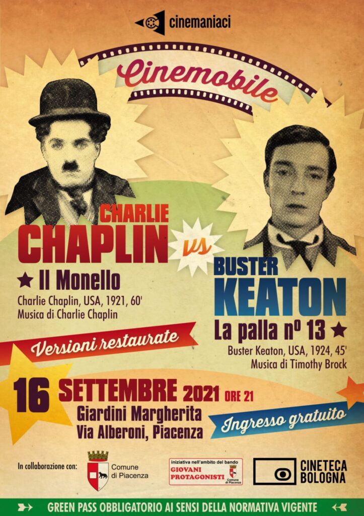 Piacenza, doppia proiezione speciale con ingresso gratuito, giovedì 16 settembre alle ore 21 ai Giardini Margherita, organizzata dai Cinemaniaci in collaborazione con il Comune di Piacenza nell’ambito del bando Giovani protagonisti. La serata vedrà infatti alternarsi sullo schermo posto all’interno dell’area verde le immagini di due classici della settima arte: “The kid – Il monello” e “Sherlock Jr. – La palla n. 13”, diretti e interpretati da due maestri del cinema, Charlie Chaplin e Buster Keaton. Le due opere saranno proposte nella versione restaurata dalla Cineteca di Bologna, con musiche nel primo caso dello stesso Chaplin, nel secondo di Timothy Brock.