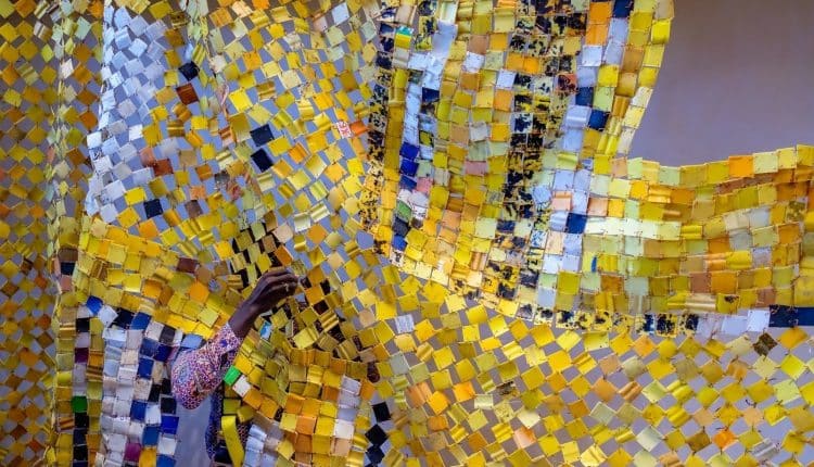 Le sue opere, che tradiscono il legame con la tradizione tessile africana del Kente, sono arditi assemblaggi che esplorano i linguaggi della forma e dell’astrazione con le quali eleva il materiale ad un potente simbolo del sistema economico, del commercio e del riutilizzo, ma anche della globalizzazione e del ruolo del Ghana in questo contesto. L’artista ghanese utilizza i gallons tagliandoli in frammenti per ridurne il volume e quindi crea questo processo di tessitura nel quale fonde diverse storie poiché i Gallons provengono da famiglie diverse e da differenti parti del paese. Ogni tessera di plastica ha tonalità di giallo diversa per la differente provenienza geografica, per il contenuto originario (benzina o olio) o a causa dell’età dei barili. “Quando unisco le tessere attraverso il processo artistico cambia la forma, cambia il valore e cambia la percezione della gente nel considerare la plastica”. Le tessere riportano anche i segni che servivano al riconoscimento dei galloni da parte dei proprietari oppure i codici a barre che creano una sorta di tessuto mimetico o i caratteri cinesi, indicativi di nuovi riferimenti di potere in Ghana. Attukwei ripropone le taniche anche per creare maschere ossessionanti, murales e installazioni di arte pubblica. Fondamentale per lui è la nozione di performance come attività quotidiana non solo perché, insieme al suo collettivo GoLokal, si esibisce spesso a fianco delle installazioni, coinvolgendo la sua comunità nel dialogo su temi di giustizia economica, ambientale e sociale, ma anche per le modalità di approccio al lavoro, alla semplice ricerca del materiale: “Abbiamo un modo molto interessante di lavorare, specialmente quando andiamo alla discarica, ci vestiamo come donne e questo è il motivo per cui tante donne raccolgono i galloni per me perché vedono che sono in grado di tradurlo in un’idea visiva a beneficio della comunità attraverso la creazione di posti di lavoro per il commerciare questi oggetti”. E ancora: ”Le persone si sentono toccate da queste esibizioni e vedono che l’arte può rompere le barriere. È fantastico per me perché vedo come l’arte possa avere un ruolo creativo nello sviluppo di una nazione”