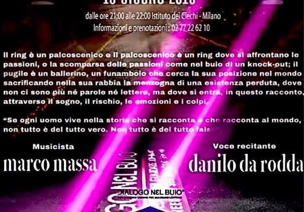 Giovedì 13 giugno (ore 21; ingresso 15-20 euro; via Vivaio 7; prenotazione obbligatoria allo 02-77226210), nell’oscurità più completa nella quale saranno immersi insieme agli spettatori, Da Rodda e Massa porteranno in scena «L’arte della fuga»: scritta da Danilo Da Rodda e Marina Brualdi e interpretata dallo stesso Da Rodda, la pièce racconta del ring che è un palcoscenico, così come il palcoscenico è un ring: qui, un pugile, funambolo tra le sedici corde, inventa la sua storia, mescolando sogni, ricordi e rimpianti. Racconta la sua verità sul mondo, perché, se ogni uomo vive nella storia che si racconta e che racconta al mondo, «non tutto è del tutto vero. Non tutto è del tutto falso».