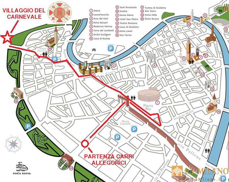 – dalle 11, per il tempo necessario al transito del corteo e del successivo passaggio dei mezzi AMIA interessati alle operazioni di pulizia delle strade, divieto di transito dei veicoli ad eccezione dei carri allegorici partecipanti alla sfilata, dei mezzi di pronto intervento e di soccorso, in Corso Porta Nuova, carreggiata con direzione da Porta Nuova a piazza Bra, piazza Bra, via degli Alpini, piazzetta Municipio, via Leoncino, Piazza Bra, via Roma, corso Castelvecchio, largo Don Bosco, Regaste San Zeno, piazzetta Portichetti, via San Giuseppe, piazza Corrubbio, nel tratto compreso tra via San Giuseppe e via Barbarani, piazza Pozza, piazza San Zeno, via Porta San Zeno, fino all’incrocio semaforico, via Vittime Civili di Guerra, circonvallazione Maroncelli, dove i carri verranno smontati, novità richiesta dagli organizzatori;