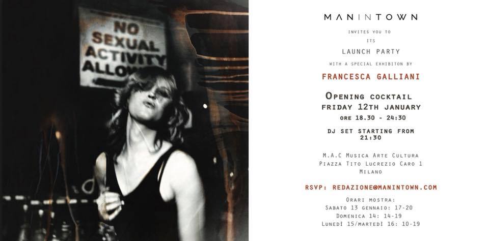 Dal 13 al 16 gennaio presso lo spazio M.A.C. Musica Arte Cultura (Piazza Tito Lucrezio Caro 1) è possibile visitare la mostra monografica ad ingresso libero “FROM HERE ON” dedicata all’artista Francesca Galliani, che torna in Italia con un progetto speciale in esclusiva per Manintown, il magazine online e cartaceo di lifestyle maschile. La mostra personale dedicata a Francesca Galliani e curata da Federico Poletti, presenta due serie inedite, una composta da ritratti di uomini e donne transgender e una legata alla continua evoluzione di New York. Immagini che raccontano l’impegno dell’artista nel difendere la libertà di espressione, i diritti umani fondamentali e la libertà civile e politica. Opening su invito venerdì 12 gennaio 2018 dalle 18.30 alle 00.30. Mostra aperta fino a martedì 16 gennaio con orari: Sabato 13 gennaio: dalle ore 17 alle ore 20, Domenica 14 gennaio: dalle ore 14 alle ore 19, Lunedì 15 e martedì 16 gennaio: dalle ore 10 alle ore 19.