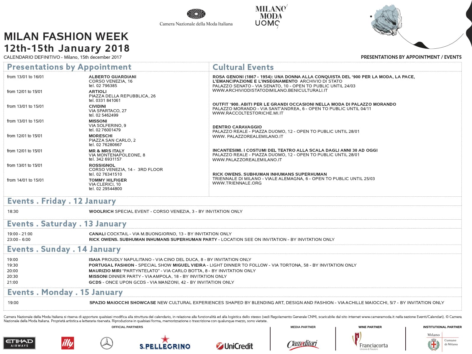 Ufficializzato il calendario degli eventi che accompagnano la Milano Fashion Week dedicata alle collezioni Uomo Fall/Winter 2018-19, in programma quest’anno dal 12 al 15 gennaio 2018.