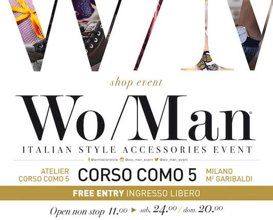 Milano 23 maggio 2017 – Torna a Milano in occasione della primavera un nuovo appuntamento moda targato Wo/Man Italian Style accessories event, l’evento giunto alla sua seconda edizione che si svolgerà dal 27 al 28 maggio nell’esclusiva cornice di Corso Como 5. L’ingresso come sempre libero, con orari dalle ore 11.00 alle 24.00 sabato e fino alle 20.00 domenica.