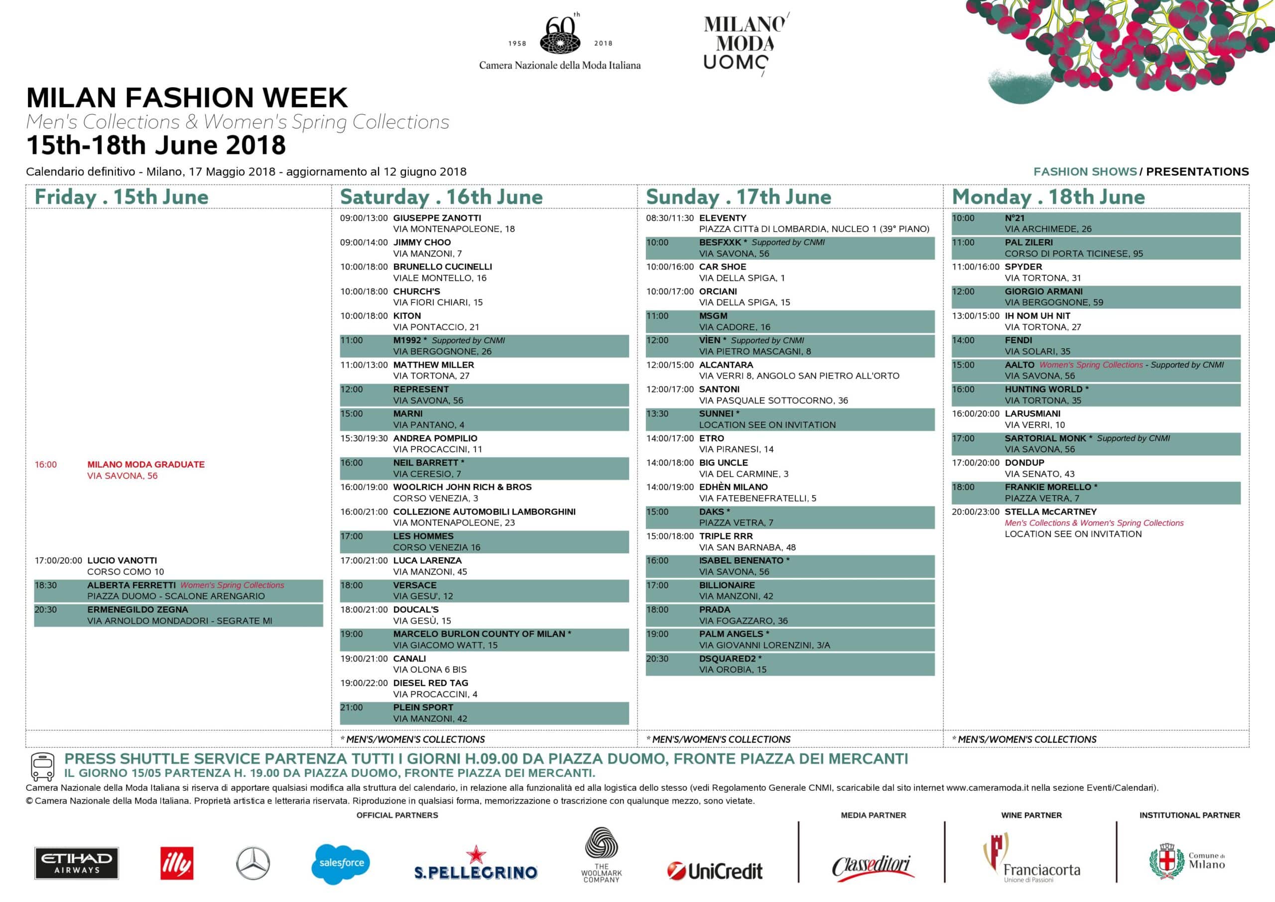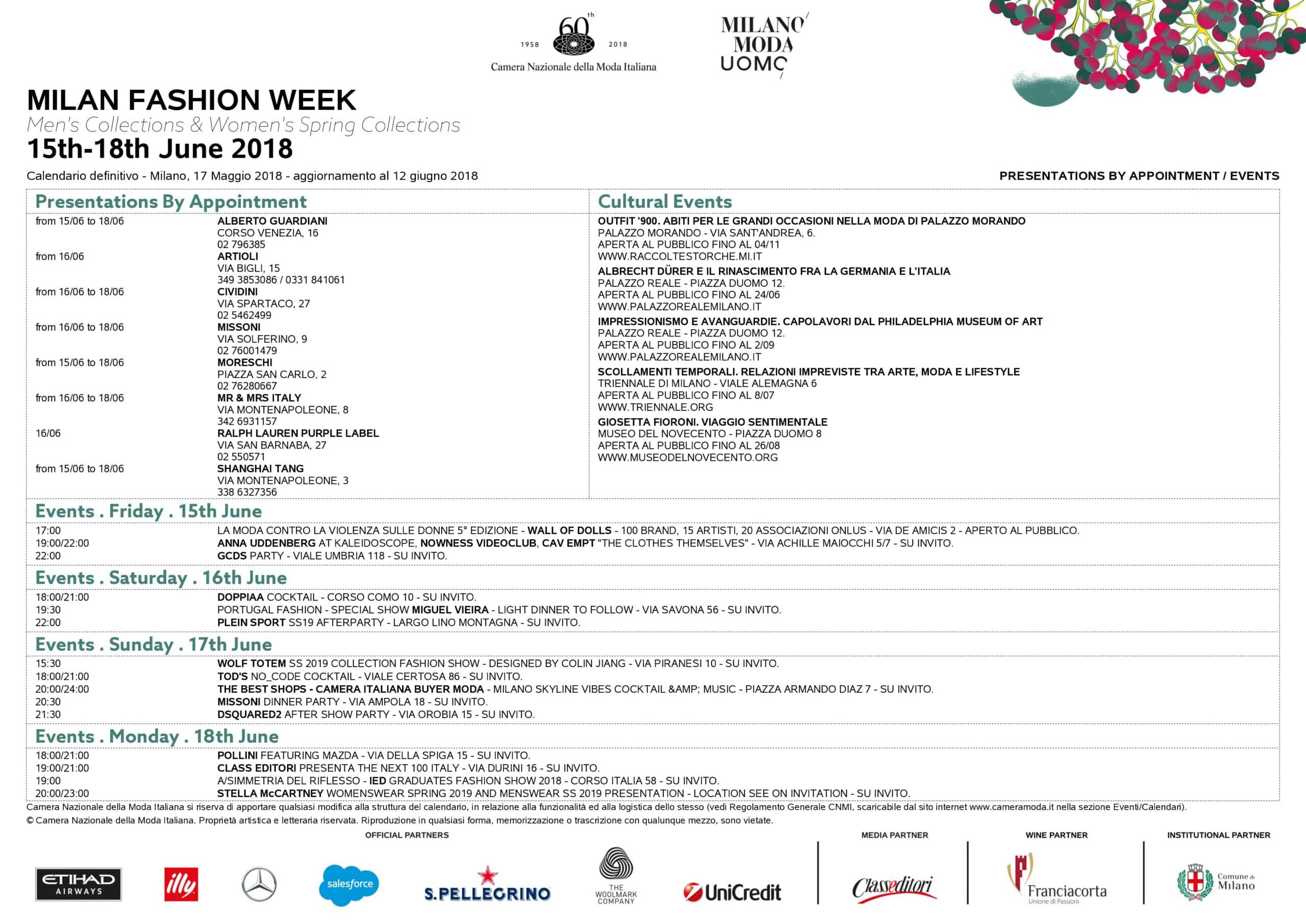 Milano, 14 giugno 2018. A Milano torna protagonista la Fashion Week per le collezioni moda uomo primavera/estate 2019 in programma dal 15 al 18 giugno 2018. Un ricco il calendario di sfilate vedrà la presenza, come sempre, di grandi nomi del fashion system internazionale.