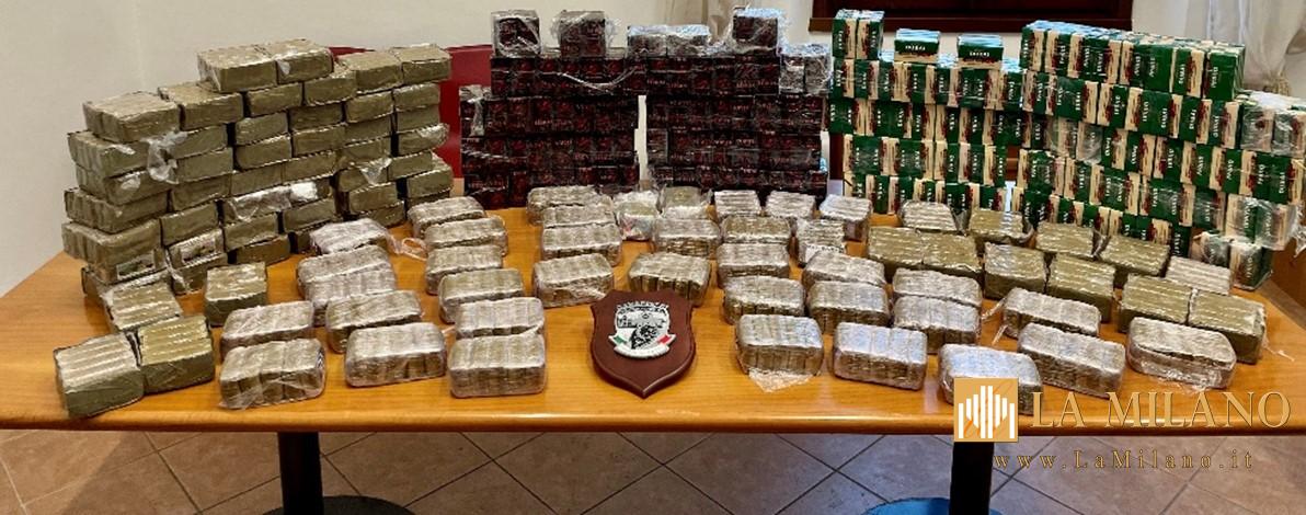 Comprendendo che l’abitazione visitata dall’uomo potesse contenere altra droga, i Carabinieri procedevano a perquisizione, rinvenendo 27,5 kg di hashish all’interno di un armadio. L’operazione proseguiva estendendo la perquisizione alla residenza dei due e alle autovetture in loro possesso: due trolley e un borsone da palestra nascosti nei bagagliai celavano ulteriori 95,5 chilogrammi di hashish.