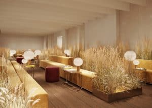 Se nella Lounge, una Galleria d’Oro realizzata con graminacee dorate accoglie gli ospiti, nel ristorante si pranza e si cena su lunghe tavolate tra nicchie a boschetto e l’effetto pergola dei gelsi, mentre il giardino interno è trasformato in un Hortus sospeso con grandi sfere di ortaggi.