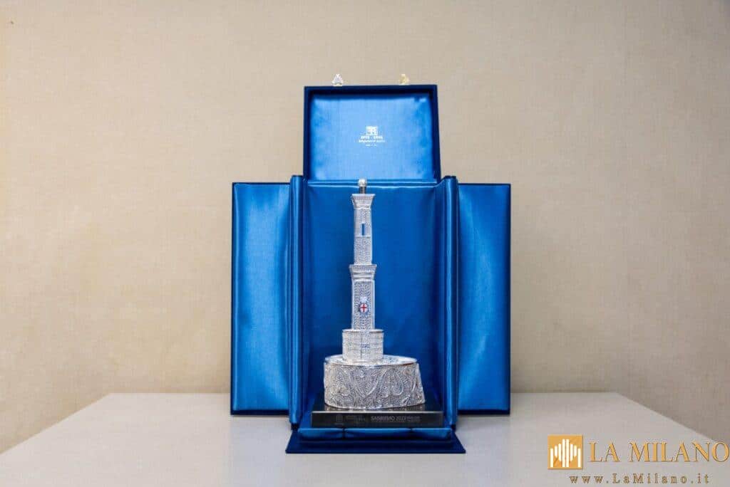 Durante la conferenza stampa è stato mostrato il premio che il presidente di Regione Liguria Giovanni Toti consegnerà, nella serata di venerdì 10 febbraio, all’artista in competizione al Festival vincitore della serata dedicata ai duetti: si tratta di una Lanterna di Genova, realizzata in filigrana di Campo Ligure.