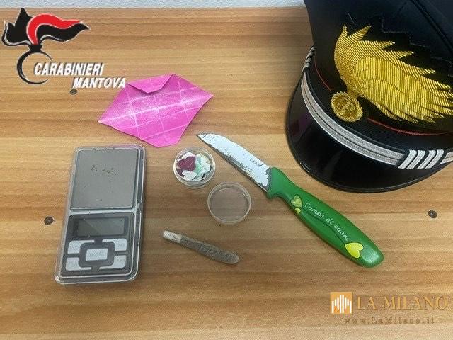 Nel corso degli accertamenti effettuati all’interno dell’abitazione, i Carabinieri hanno rinvenuto una cartina contenente circa 0,70 grammi di ketamina, oltre a un coltello con lama lunga 9 centimetri, un bilancino di precisione e materiale per il confezionamento di sostanze stupefacenti. Tutto il materiale è stato immediatamente posto sotto sequestro.