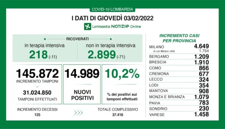 Coronavirus in Lombardia, i dati di mercoledì 3 febbraio 2022