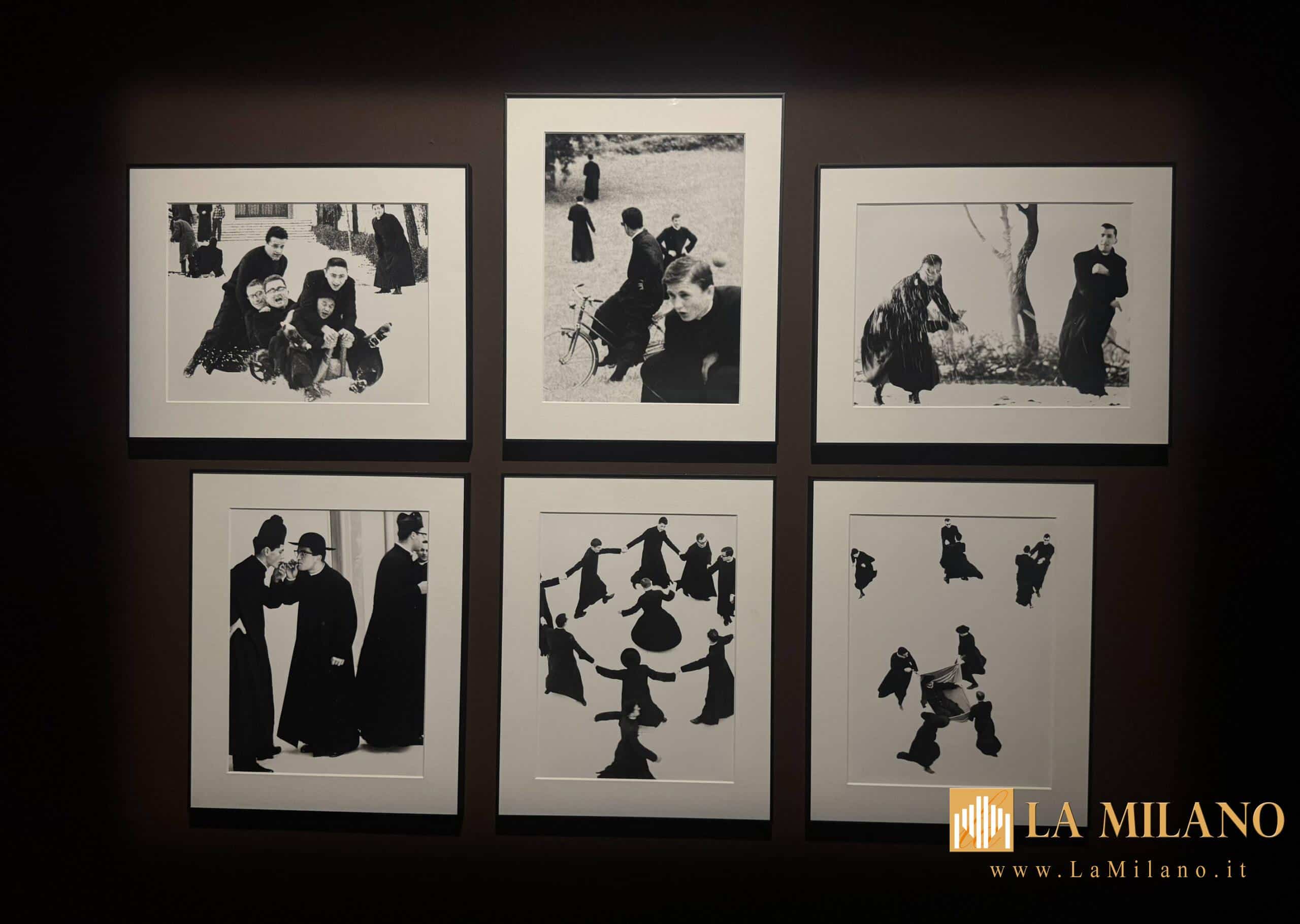 Cuore pulsante della mostra è una sala dedicata alla straordinaria serie “Io non ho mani che mi accarezzino il volto” (1961/63), ispirata alla poesia di Padre David Maria Turoldo, il cui titolo diventa emblema visivo e concettuale di un’opera intensa e senza tempo. Le immagini dei giovani seminaristi, sospese tra innocenza e inquietudine, movimento e contemplazione, trasformano il quotidiano in una danza tra laico e spirituale.