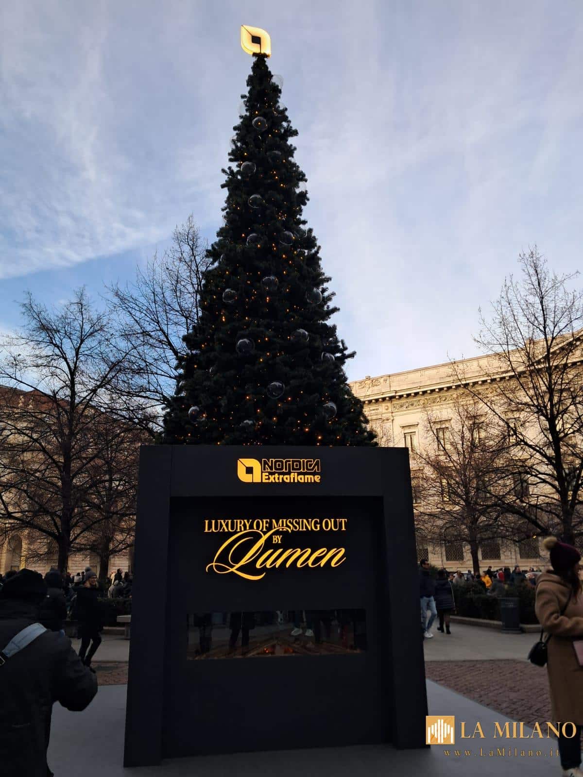 Un albero che unisce design contemporaneo e tradizione, con una “fiamma urbana” simbolo di calore condiviso. - Piazza Mercanti – Questo albero non fa scena. Fa ricerca (AIRC e Banco BPM)