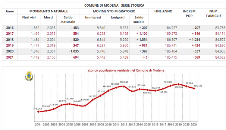 Continua a diminuire la popolazione di Modena e, dopo sei anni, ritorna sotto quota 185mila residenti. Nel 2022, infatti, il costante calo delle immigrazioni verso il territorio comunale, abbinato a un consistente aumento delle emigrazioni, ha avuto come effetto una netta diminuzione della popolazione residente che risulta di poco superiore alle 184mila unità.