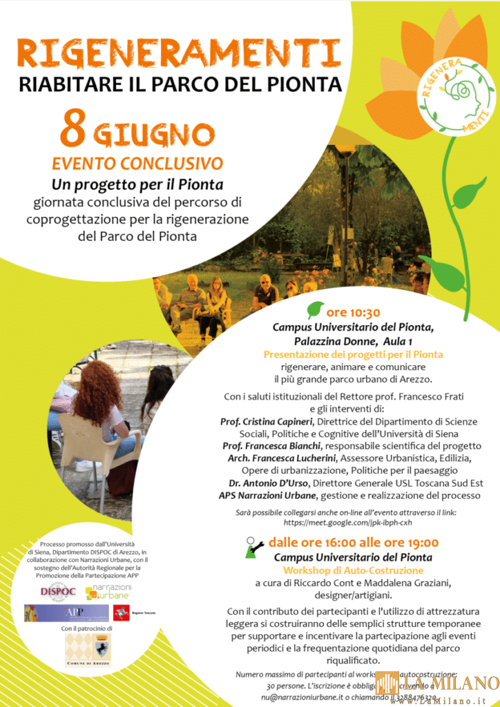 Saranno presentati mercoledì 8 giugno alle 10,30 i risultati del percorso “Rigeneramenti. Riabitare il Parco del Pionta”, un articolato processo di progettazione partecipata per rigenerare uno dei parchi simbolo di Arezzo promosso dall’Università di Siena, dipartimento di Scienze storiche e dei beni culturali (DISPOC) della sede di Arezzo, in collaborazione con la APS Narrazioni Urbane, con il contributo dell’Autorità regionale per la partecipazione e il patrocinio del Comune.