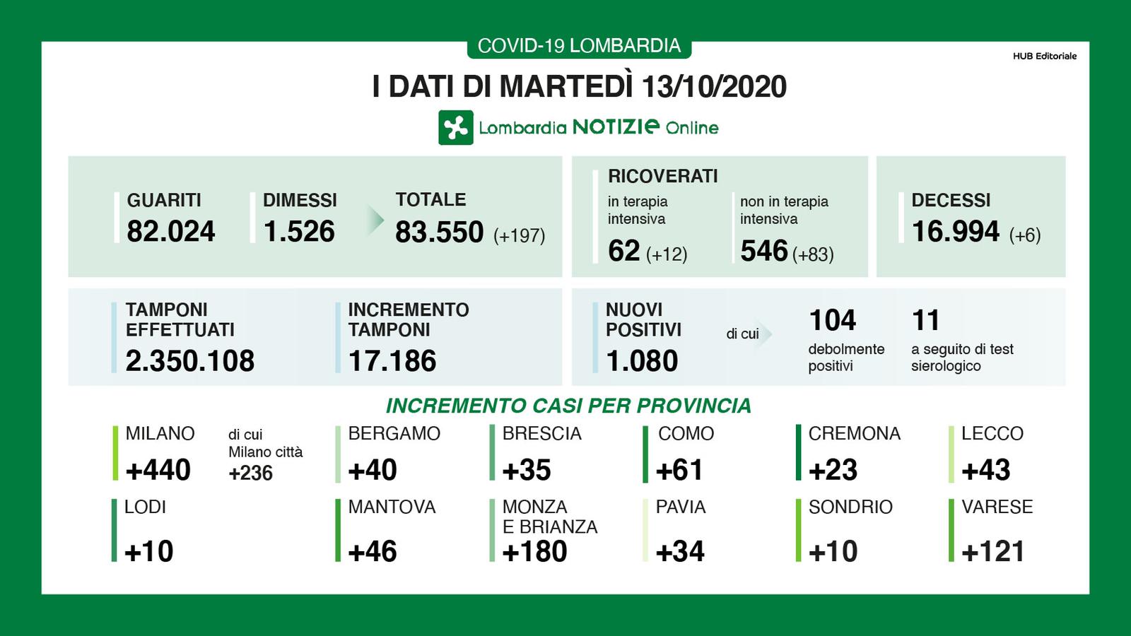 Milano, 13 Ottobre 2020 – Sono 83.550 i guariti/dimessi, 1.080 i nuovi positivi con 17.186 tamponi effettuati, per una percentuale pari al 6,2%.
