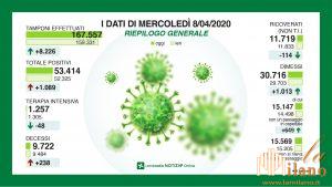 Milano, 08 Aprile 2020 – La slide con i dati regionali sul contagio da coronavirus presentati in conferenza stampa dall’assessore al Welfare, Giulio Gallera che ha, poi, sottolineato la fase discendente dei contagi relativi al virus, invitando tutti ad un ultimo grande sforzo rimanendo nelle proprie abitazioni.