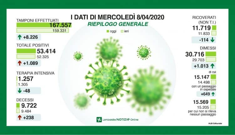Milano, 08 Aprile 2020 – La slide con i dati regionali sul contagio da coronavirus presentati in conferenza stampa dall’assessore al Welfare, Giulio Gallera che ha, poi, sottolineato la fase discendente dei contagi relativi al virus, invitando tutti ad un ultimo grande sforzo rimanendo nelle proprie abitazioni.