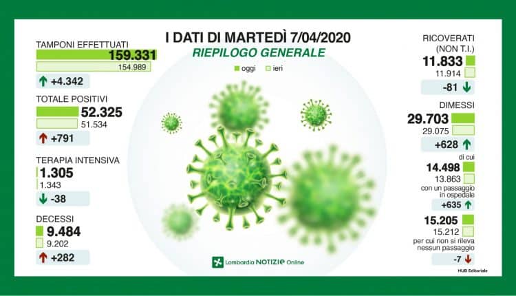 Milano, 07 Aprile 2020 – La slide con i dati regionali sul contagio da coronavirus presentati in conferenza stampa dall’assessore al Welfare, Giulio Gallera che ha, poi, sottolineato come tutti gli indicatori siano positivi invitando tutti ad un ultimo grande sforzo.