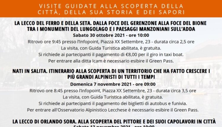 Il primo appuntamento è in programma sabato 30 ottobre con “La Lecco del ferro e della seta”, dalla foce del Gerenzone alla foce del Bione, tra i monumenti del lungolago e i paesaggi manzoniani sull’Adda: un itinerario alla scoperta della tradizione industriale antica di Lecco, legata al ferro e alla seta e generata dallo sfruttamento dei torrenti Gerenzone, Caldone e Bione e, sino a metà Ottocento, dalla ricchezza di ferro nelle miniere della Valsassina e di gelsi in tutto il territorio lecchese. Domenica 7 novembre la seconda visita: “Nati in salita”, un itinerario alla scoperta di un territorio che ha fatto crescere i più grandi alpinisti di tutti i tempi con l’obiettivo è scoprire la tradizione alpinistica lecchese, una storia di eccellenza e di fama mondiale determinata dalle condizioni favorevoli e uniche che i grandi alpinisti del territorio hanno trovato a Lecco. Si prosegue sabato 13 novembre con “La Lecco di Orlando Sora”, alla scoperta del pittore e dei suoi capolavori in città: riscoprire un pittore che a Lecco ha lasciato grande traccia di sé in diversi monumenti ed edifici religiosi e civili. L’ultimo appuntamento è in programma domenica 21 novembre con “Di pietra e bronzo”: Lecco, storie curiose e personaggi illustri in un racconto attraverso i monumenti del lungolago che propone la storia di Lecco dalla prospettiva degli uomini illustri che, con il loro vissuto e il loro operato, hanno creato un legame indissolubile con la città.