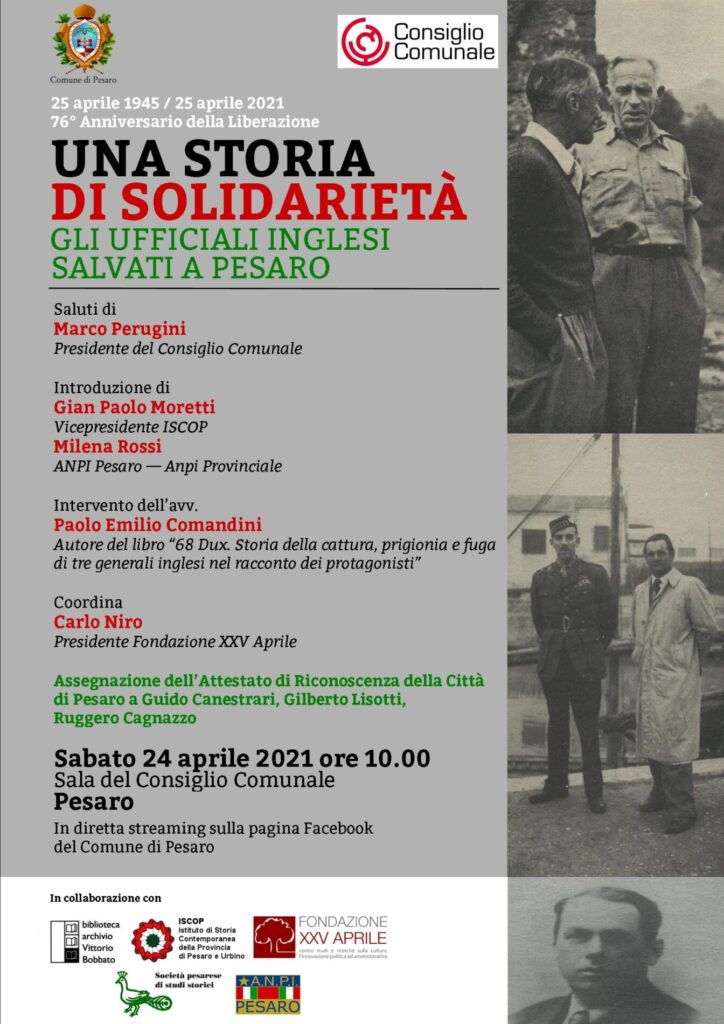Pesaro, doppio appuntamento, questo fine settimana, per ricordare e celebrare il 76° anniversario della Liberazione nazi-fascista. Si parte sabato 24 aprile, alle ore 10, con la diretta streaming prevista sui canali social del Comune (pagina Facebook @comunedipesaro e @presidentemarcoperugini e canale Youtube Comune di Pesaro) “Una storia di solidarietà. Gli ufficiali inglesi salvati a Pesaro”, evento promosso dalla Presidenza del Consiglio comunale in collaborazione con la Biblioteca Bobbato, l’Iscop (Istituto di storia contemporanea di Pesaro e Urbino), Fondazione XXV Aprile, la Società pesarese di studi storici e Anpi Pesaro.