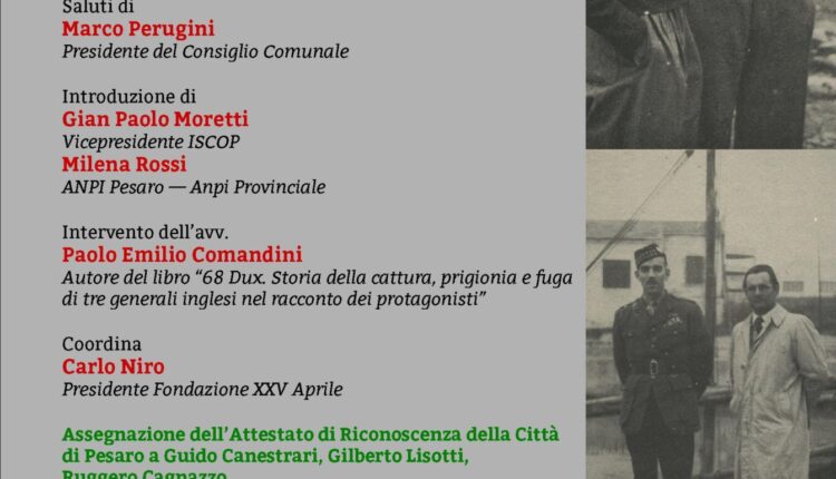 L’evento prevede i saluti del presidente del Consiglio comunale Marco Perugini, a cui seguiranno quelli di Carlo Niro, presidente Fondazione XXV Aprile, che introdurrà gli interventi di Gian Paolo Moretti, vicepresidente Iscop e di Milena Rossi, Anpi e la presentazione che Paolo Emilio Comandini, farà del suo libro “68 Dux. Storia della cattura, prigionia e fuga di tre generali inglesi nel racconto dei protagonisti”.