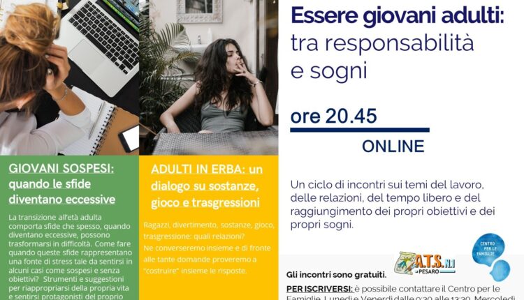 Pesaro, Al via il ciclo di incontri gratuiti online “Essere giovani adulti: tra responsabilità e sogni” organizzato con il Centro per le famiglie dell’ATS 1. Gli appuntamenti tratteranno i temi del lavoro, delle relazioni, del tempo libero e del raggiungimento degli obiettivi dei giovani.