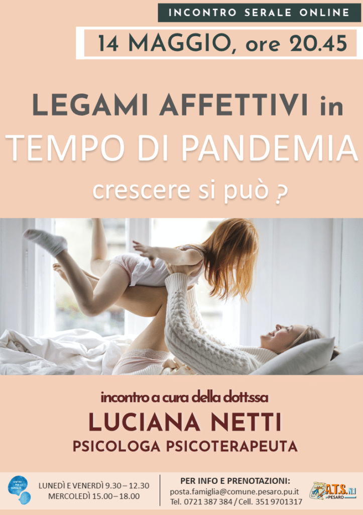 Pesaro, è l’incontro gratuito “Legami affettivi in tempo di pandemia: crescere si può?” in programma domani, venerdì 14 maggio, alle 20.45, online su Google meet a concludere la “Settimana della Mamma” organizzata dal Centro per le Famiglie di Pesaro e Gabicce Mare.