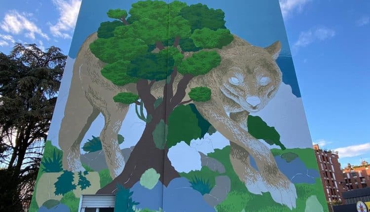 Milano, in via Palmanova un murale di un lupo sulla facciata di un palazzo popolare