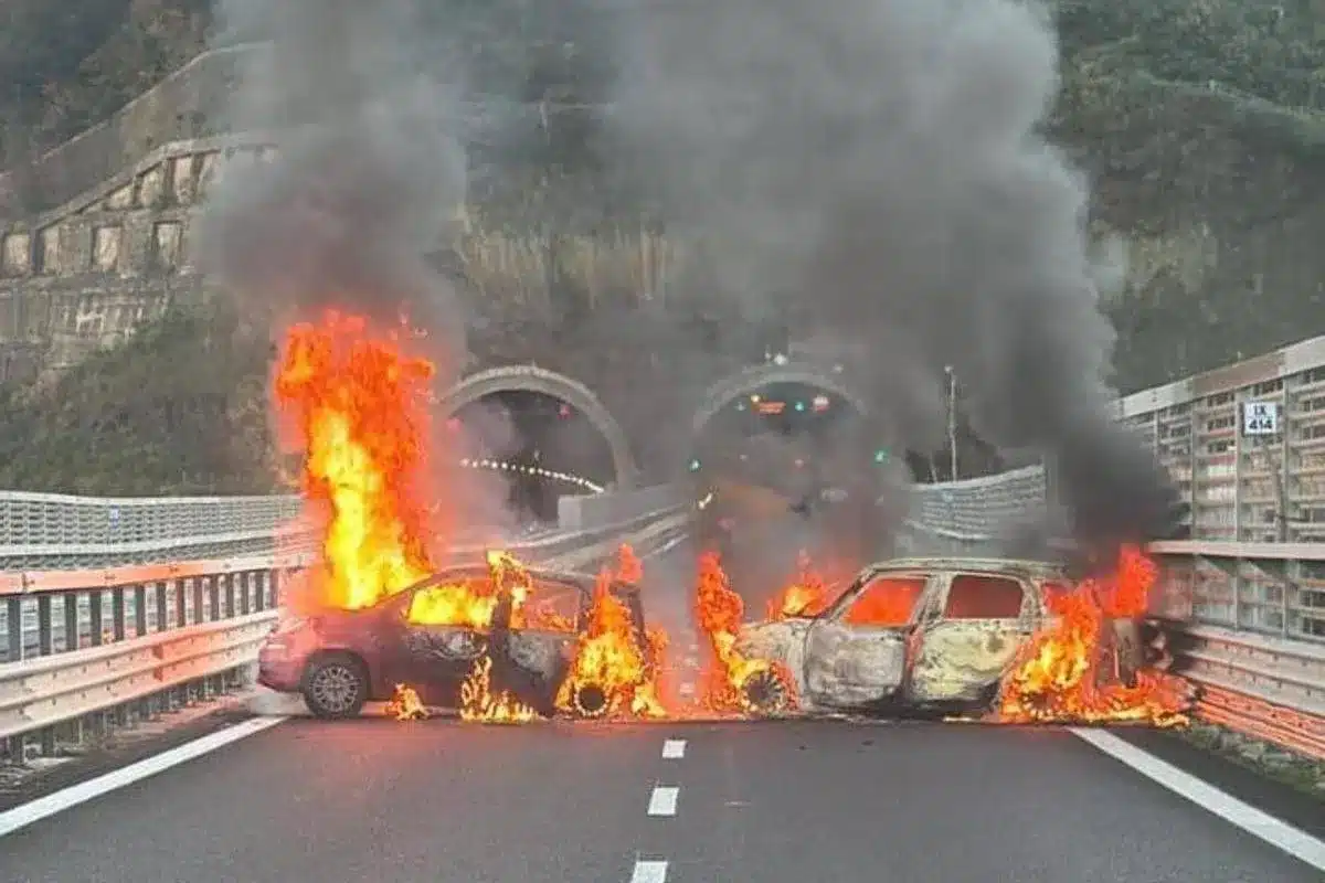 Le stesse vetture sono state incendiate immediatamente, sprigionando alte colonne di fumo e rendendo impossibile l’accesso al tratto autostradale.