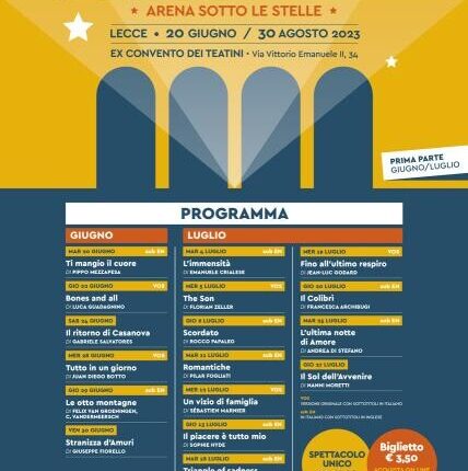 Per il sesto anno consecutivo, Teatini Cinema animerà nei mesi di giugno, luglio e agosto il Chiostro dei Teatini nel centro storico della Città di Lecce, con un’offerta culturale di qualità e proponendo al pubblico film d’autore della stagione appena trascorsa.