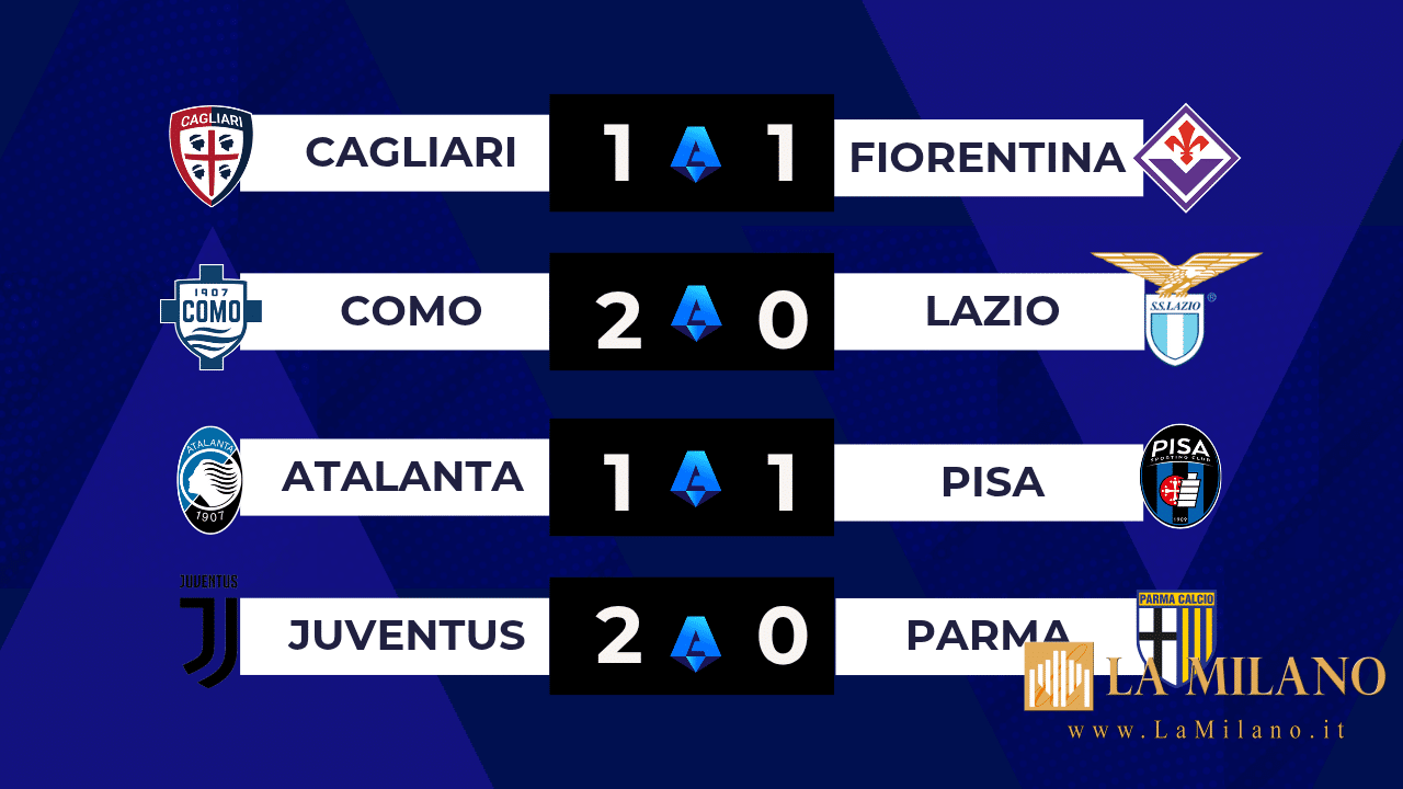 Cagliari-Fiorentina 1-1 | Como-Lazio 2-0 | Atalanta-Pisa 1-1 | Juventus-Parma 2-0