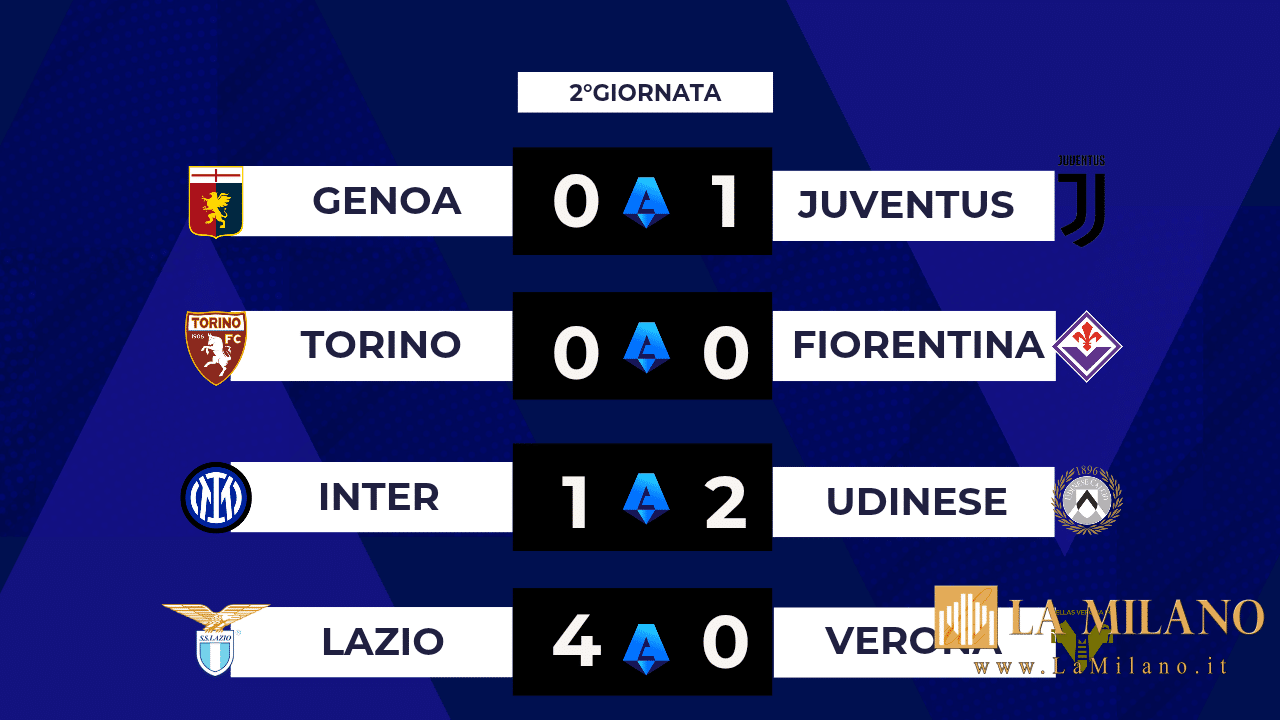 Anche la seconda giornata di campionato si è conclusa e anche in questa domenica di Serie A non sono mancate le sorprese. La Juventus vince a Genoa grazie alla seconda rete di Vlahovic, mentre Torino-Fiorentina termina a reti bianche. La Lazio dimentica la sconfitta di Como e ne fa quattro al Verona, a San Siro arriva invece il colpaccio dell’Udinese che vince 2-1 contro l’Inter.