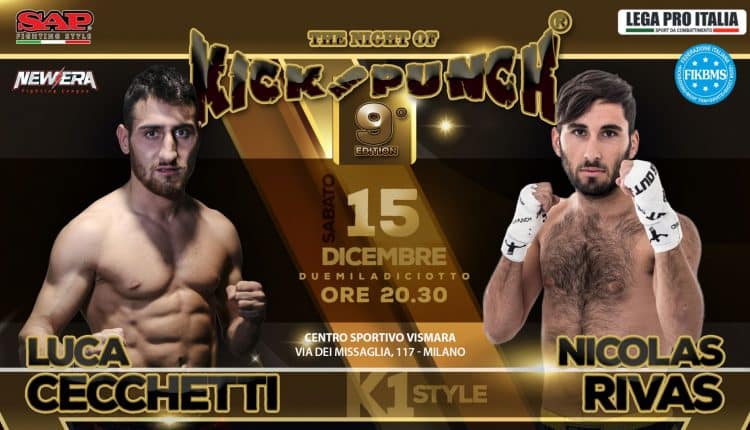 Dopo un anno di assenza dalle competizioni, il campione del mondo dei pesi piuma WAKO-PRO Luca Cecchetti tornerà sul ring contro il francese Nicolas Rivas sulla distanza delle 3 riprese da 3 minuti ciascuna sabato 15 dicembre alla The Night of Kick and Punch 9, organizzata da Angelo Valente e dalla Sap Fighting Style al centro sportivo Vismara di Milano e presentata da Elisabetta Canalis. L’evento inizierà alle 18.00, ma i combattimenti più importanti cominceranno alle 20.30 e dovrebbero concludersi intorno alla mezzanotte (dipenderà dall’esito, se termineranno tutti ai punti o qualcuno prima del limite). I biglietti costano 33 euro (bordo ring) e 22 euro (tribuna) e si possono acquistare telefonando allo 02-90723329 ed agli altri punti vendita segnalati sulla pagina Facebook “Kick and Punch Palestra”.